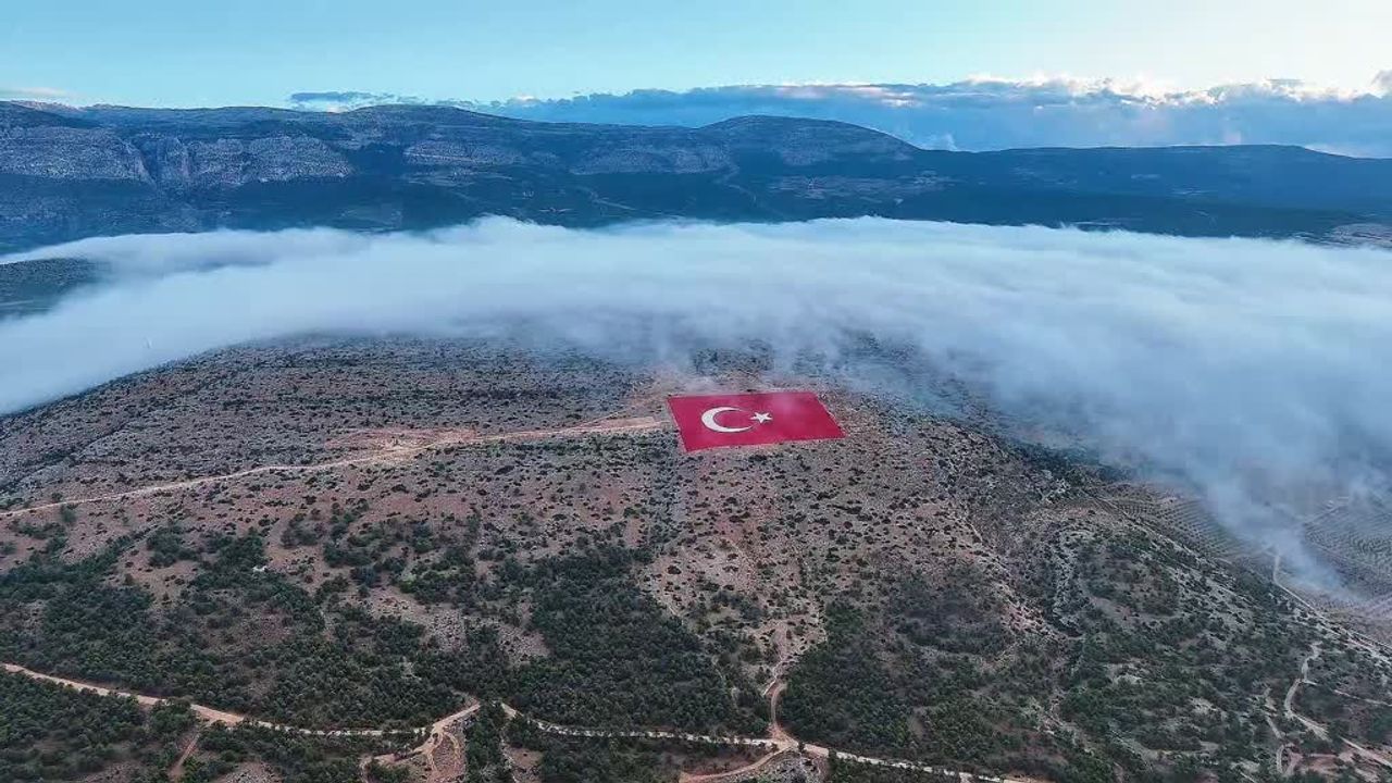 Mersin'in Mut ilçesinde 22 dönümlük araziye işlenen Türk bayrağı siste görüntülendi.