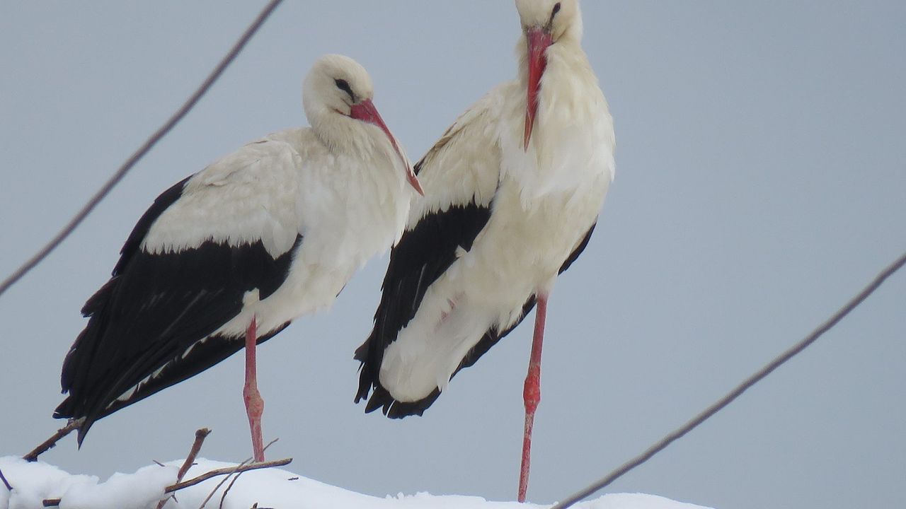 İlçedeki bir elektrik direğine yaptıkları yuvaları karla dolan leylekler, uzun süre yuvalarını terk etmeyerek vücutlarını temizlemeye çalıştı.