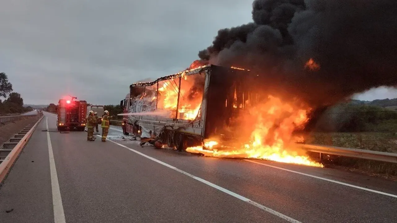 D.O. idaresindeki 35 BSK 250 plakalı tırın dorsesi, Balıkesir-Bursa kara yolu Karapürçek mevkisinde tekerlerindeki körük sisteminde oluşan arıza nedeniyle alev aldı.