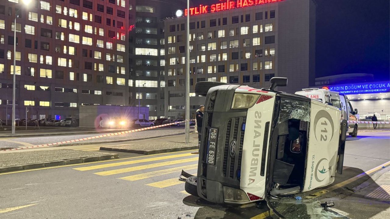 Ankara Etlik Şehir Hastanesi Kadın Doğum ve Çocuk Acil Bölümü'nde otomobil ambulansa çarptı. Ambulans, çarpmanın etkisiyle devrildi.