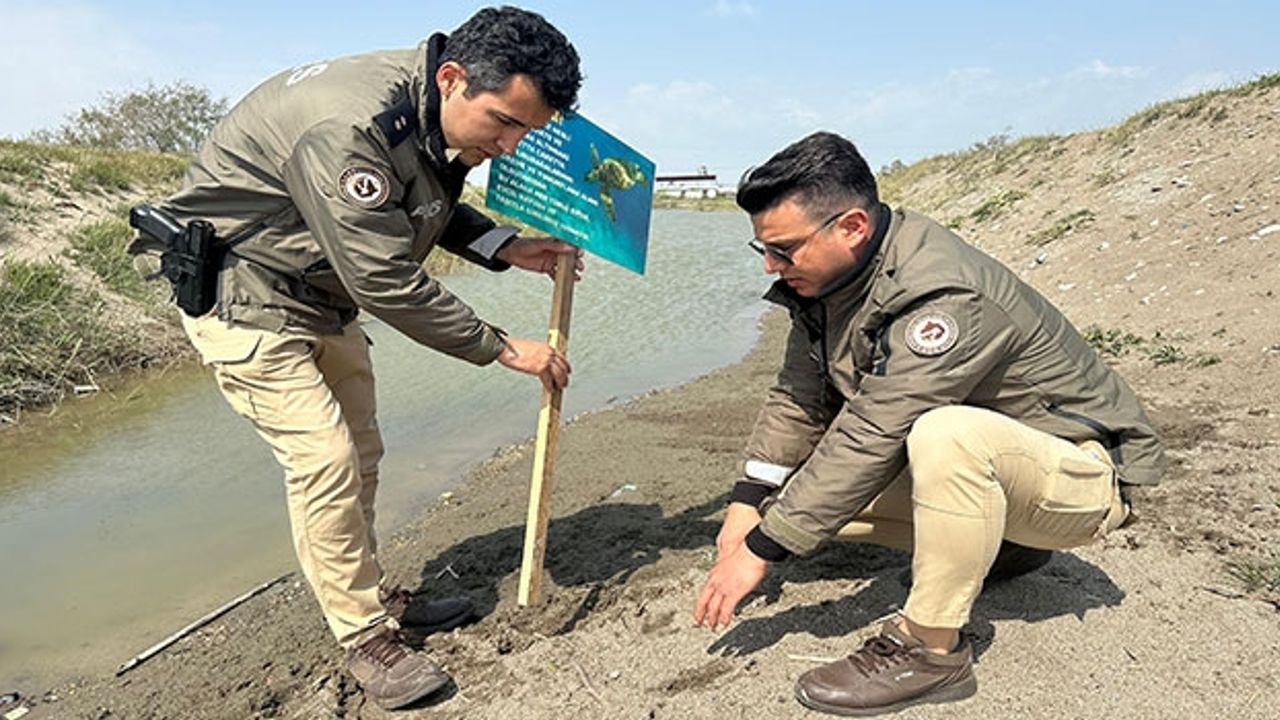 Mersin'de polis ekipleri, caretta carettaların yumurta bıraktığı merkez Akdeniz ilçesindeki Kazanlı Sahili'ne uyarı levhaları koydu.