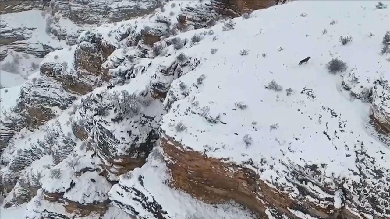 Erzurum'un Oltu ilçesinin yüksek kesimlerinde, koruma altındaki yaban keçileri ve kurt, karla kaplı zirvede yiyecek ararken birlikte görüntülendi