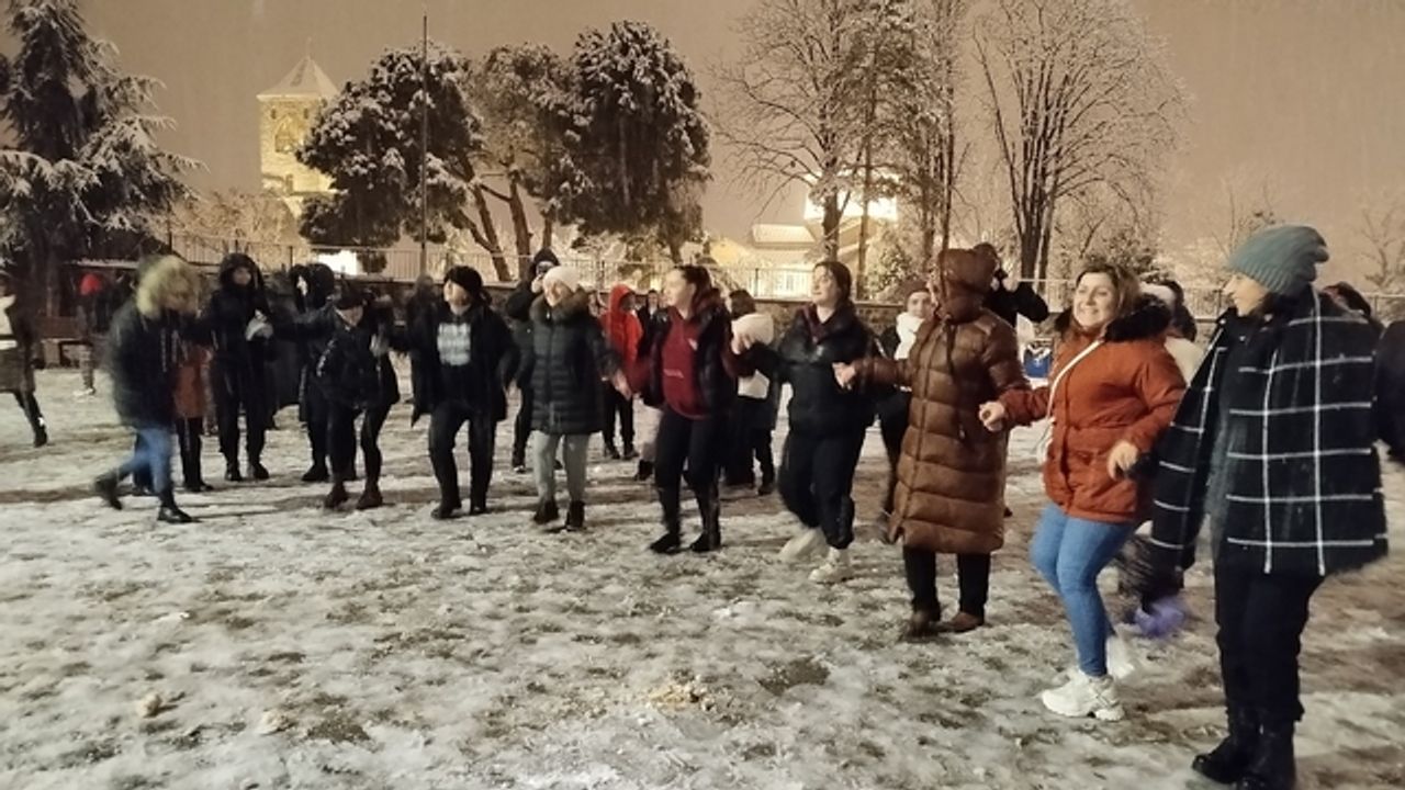 Trabzon'da dün gece etkili olan yoğun kar yağışı nedeniyle okullar tatil edildi. Kar yağışını fırsat bilen çocuklar ve aileleri Ayasofya Camii önündeki alanda toplandı. Aileler, kar üzerinde horon ve kolbastı oynadı.
