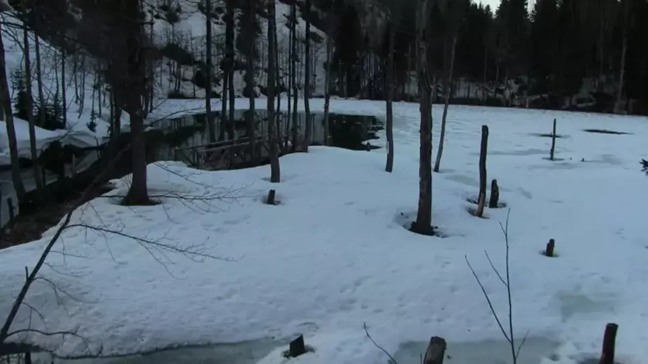 Artvin'in Borçka ilçesinde etkili olan kar yağışının ardından Karagöl’ün yüzeyi dondu.