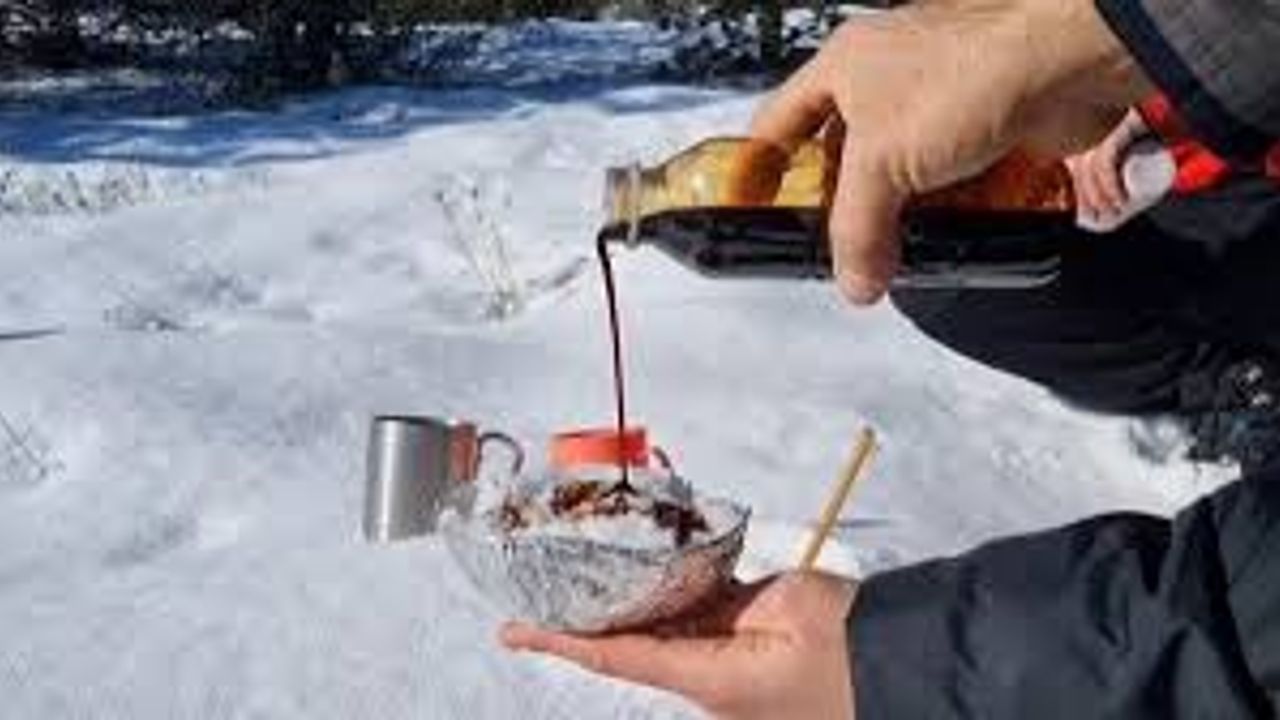 Kırşehir'de Kervansaray Dağı’nda 1571 metre rakımdaki kamp alanında çadır kuran dağcılar, pekmezle karı buluşturarak ‘karsambaç’ yapıp yedi.
