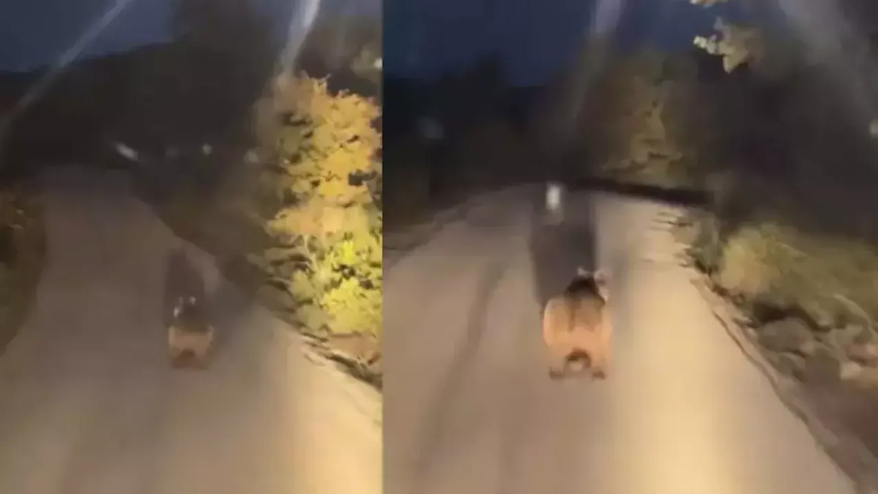 Biga ilçesi Elmalı köyü yolunda otomobili ile seyir halinde olan bir sürücü, yolda bir ayı gördü. Sürücü, cep telefonuyla ayıyı kayda aldı. Bir süre otomobilin önünde koşan ayı daha sonra...