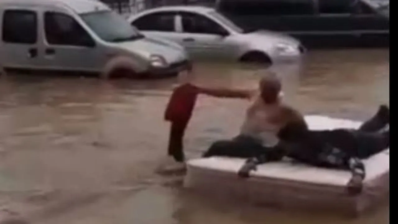 Trabzon'da etkili olan sağanakta, su birikintisi oluşan yolda bir esnaf, sal yaptığı yatakla gezdi. Kamerayla görüntülenen o anlar, izleyenleri tebessüm ettirdi.