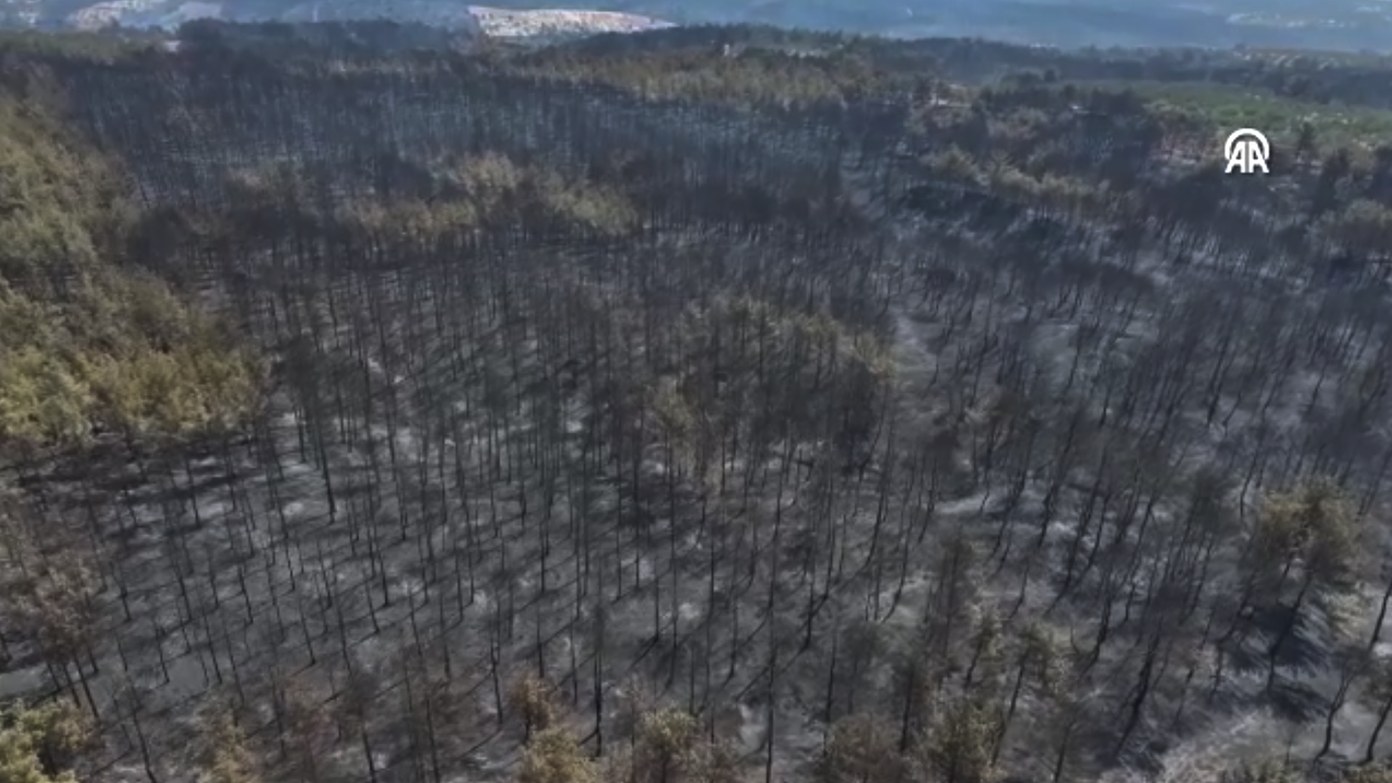 Çanakkale merkez ve Bayramiç ilçesinde çıkan ve büyük ölçüde kontrol altına alınan yangından etkilenen ormanlık alan helikopterden görüntülendi.