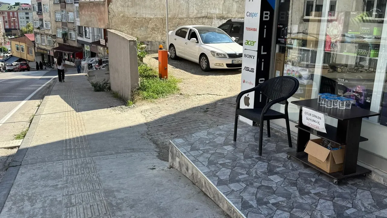 Ordu'da bilgisayar tamiri yapan Mertcan Mercan (28), hastaneye giden yokuş yolu çıkarken yorulan kişilerin dinlenmesi için dükkanının önüne sandalye ve masa koyup, ücretsiz su ikram ediyor.